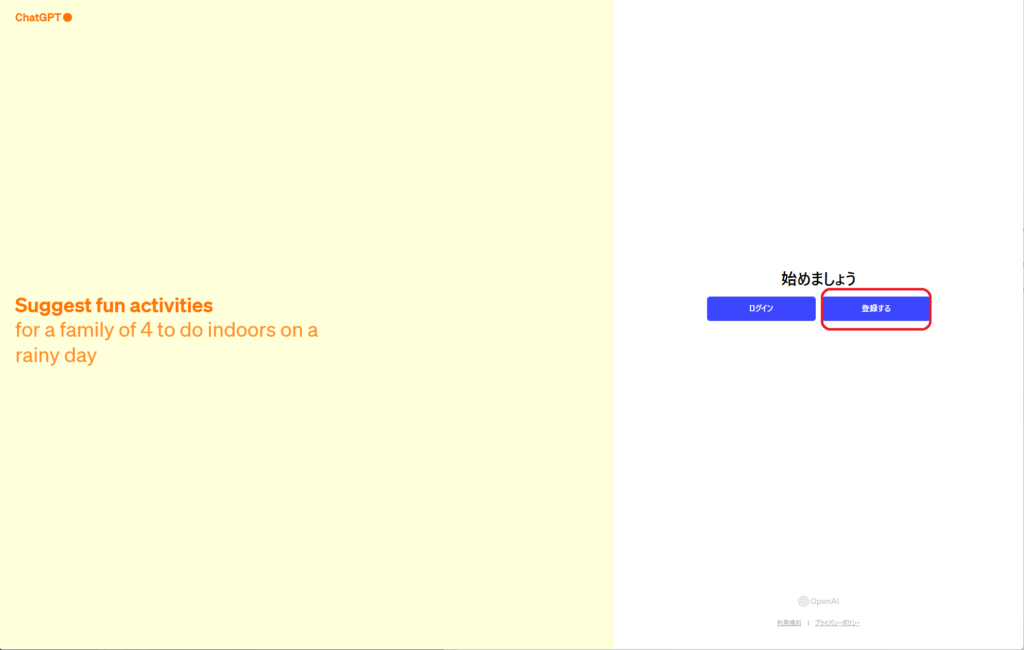 ChatGPTを利用するには、OpenAIのアカウントが必要です。サイト上で「登録」(サインアップ)を選択し、必要な情報(登録可能なメールアドレス、パスワード等)を入力してアカウントを作成します。すでにアカウントを持っている場合は、「Log In」(ログイン)を選択してサインインしてください。